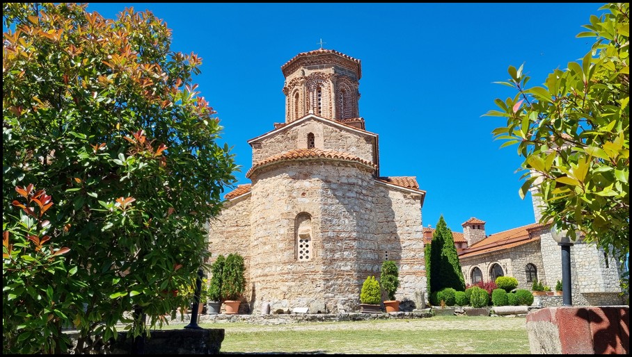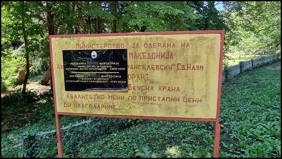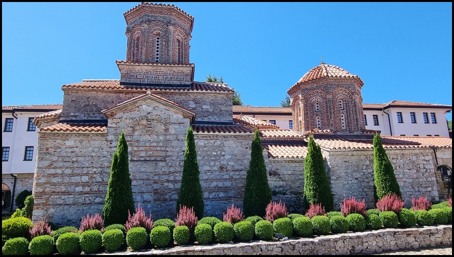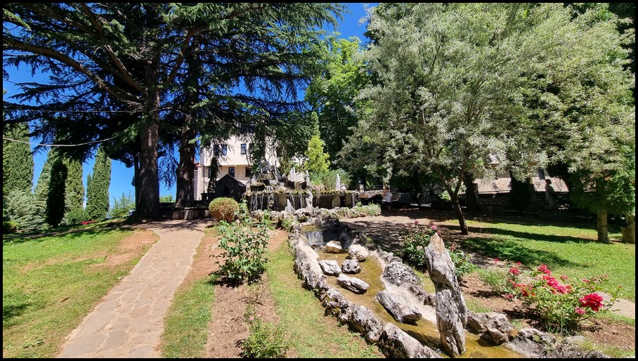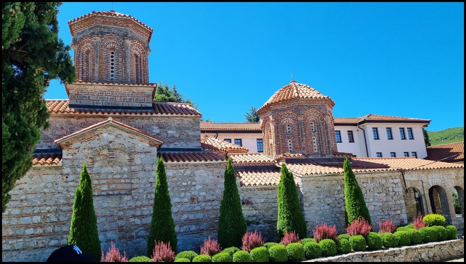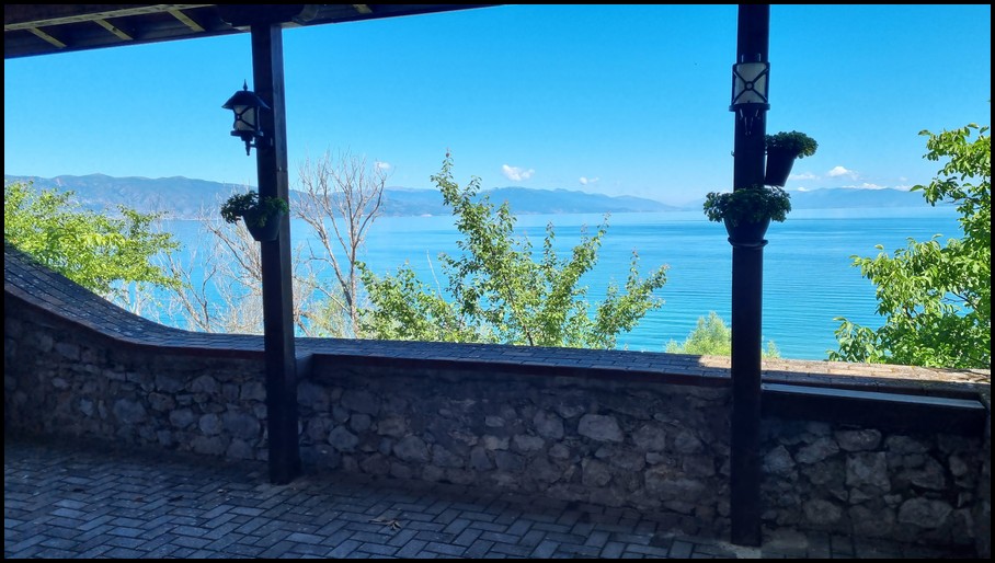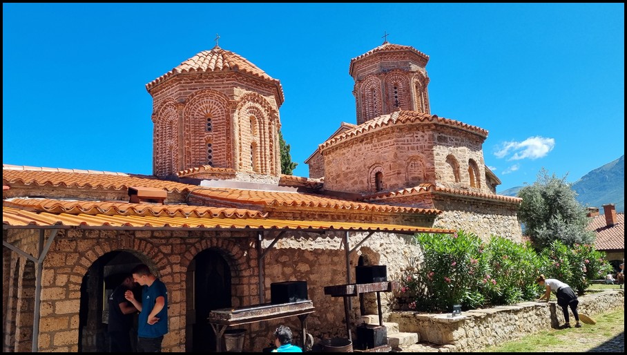 Aprés un orage hier au soir l'électricité a été coupée jusqu'à aujourd'hui 18 heures. Il parait que cela est trés fréquent en Macédoine. L'information nous a été donnée par la réception et c'est surement pour ça que nous avons remarqués beaucoup de groupes électrogènes un peu partout. Ce matin nous allons visiter le Monastère de Saint-Naum qui se trouve à 3.5 kms de notre camping. La visite depuis le camping se fera à pied. Le monastère Saint-Naum est un monastère construit à partir du Xᵉ siècle au bord du lac d'Ohrid. Il s'agit d'un des lieux les plus touristiques de la Macédoine du Nord, grâce à son cadre naturel exceptionnel, à son histoire et à son architecture, typiquement byzantine. Effectivement l'endroit est trés charmant et reposant le Monastère est magnifique, et nous profitons de son merveilleux paysage ainsi que ses parcs fleuris avec cette vue sur le splendide lac d’Ohrid. Nous avons passé une grande partie de l'aprés-midi dans le petit parc que nous avions traversés, celà nous a permis de nous tenir à l'ombre car la tempèrature est élevée.