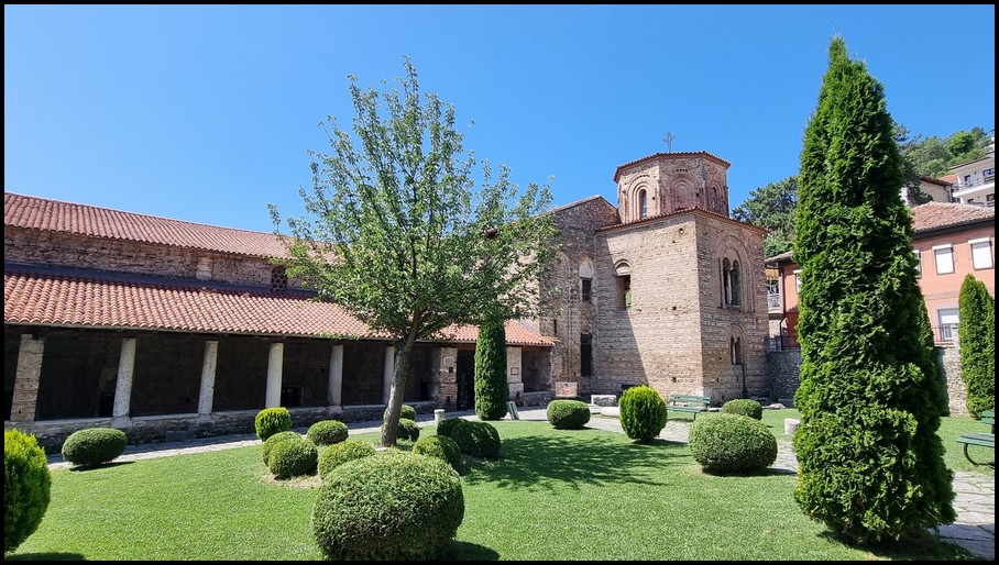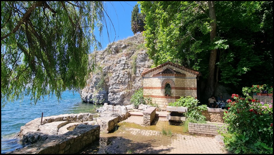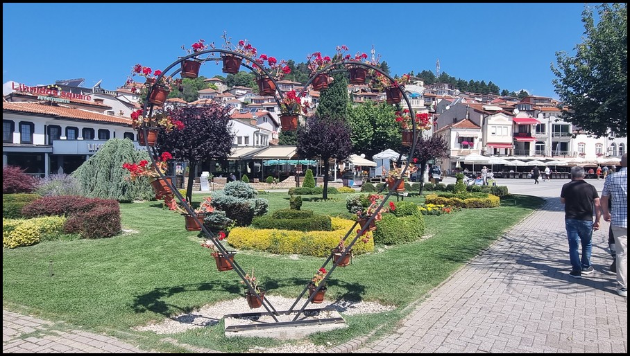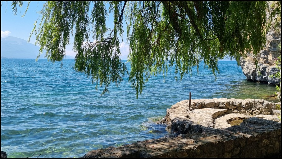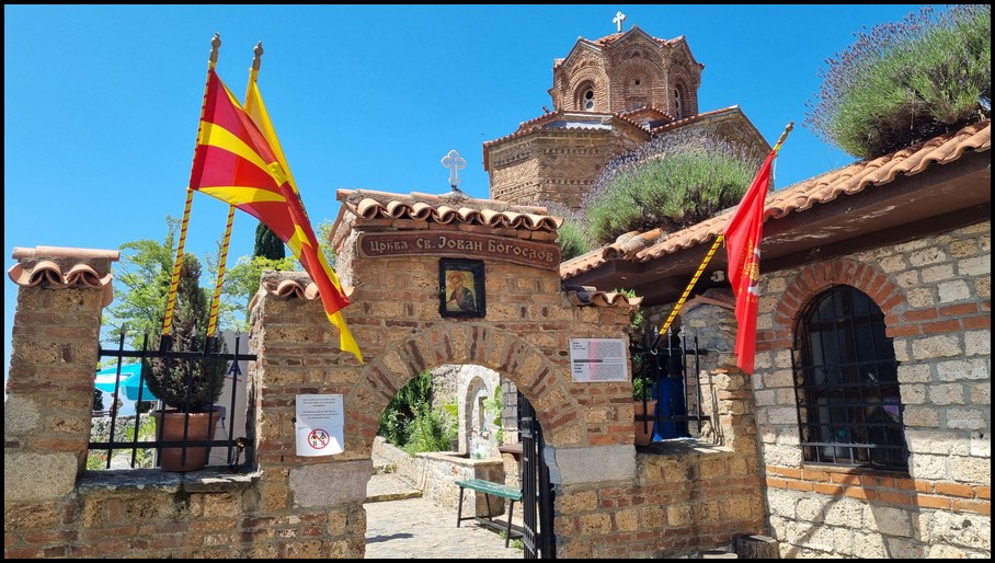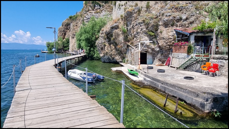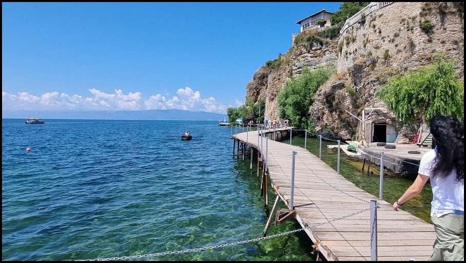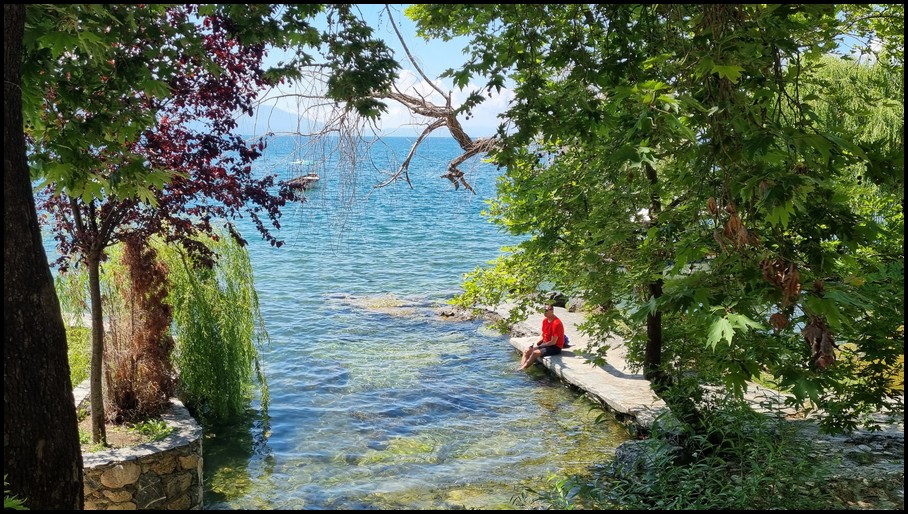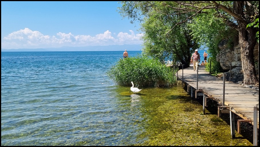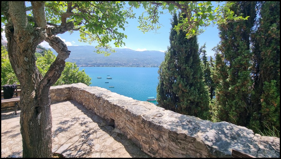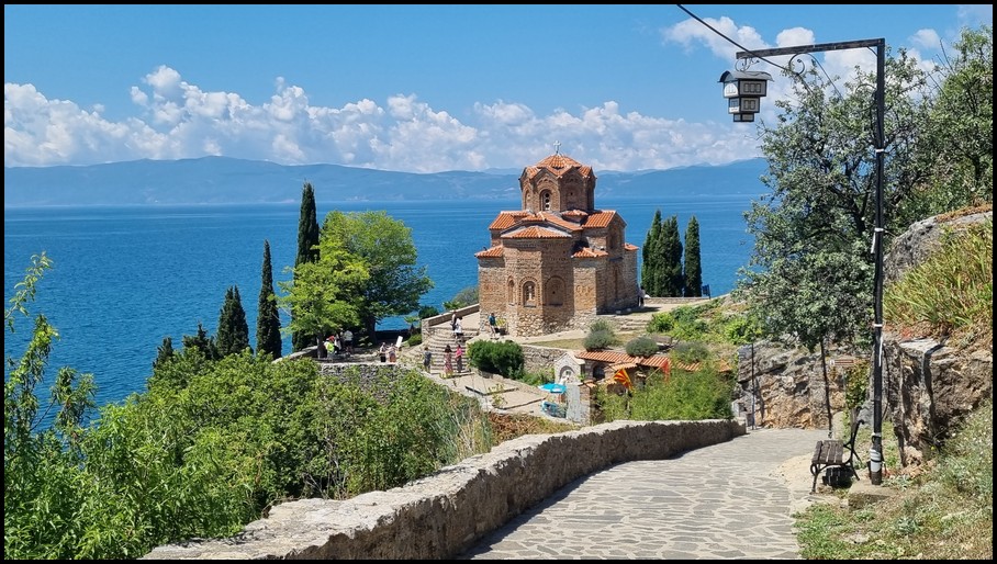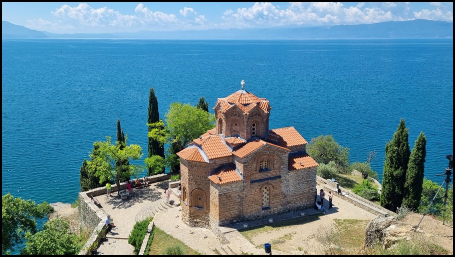 Le soleil est au rendez vous ce matin pour aller visiter la ville d'Ohrid, à 30 kms d'ici. Cette ville est inscrite au patrimoine mondial de l'Unesco. Nous prenons le bus à 9 heures pour 4.50€ pour nous deux. Le trajet dure 30 minutes pour arriver au terminus.La ville d'Ohrid est une petite station balnéaire située sur les rives vallonnées du lac d'Ohrid, au sud-ouest de la République de Macédoine. Dans la vieille ville compacte, les églises médiévales, les monastères et les ruines d'anciens édifices côtoient les maisons traditionnelles aux toits rouges. Au sommet de la colline, les murs massifs de la forteresse de Samuel, vieille de plusieurs siècles, dominent l'horizon de la ville. Nous rejoignons le bord de mer pour aller voir l'église Saint jean de Kanéo qui surplombe le lac on emprunte une petite rue et des passerelles qui longent le lac avant d'arriver à l'église. Un point de vue manifique s'offre à nous. Retour par le haut de la ville, les tourismes sont nombreux, la pause déjeuner se fera sur place et le retour à 16h30 en taxi pour 9€ le bus étant partis en fin de journée.
