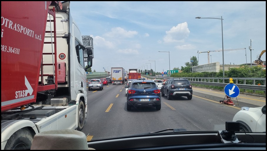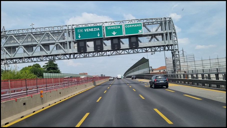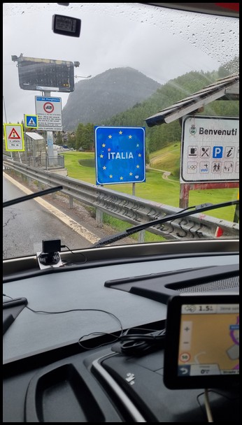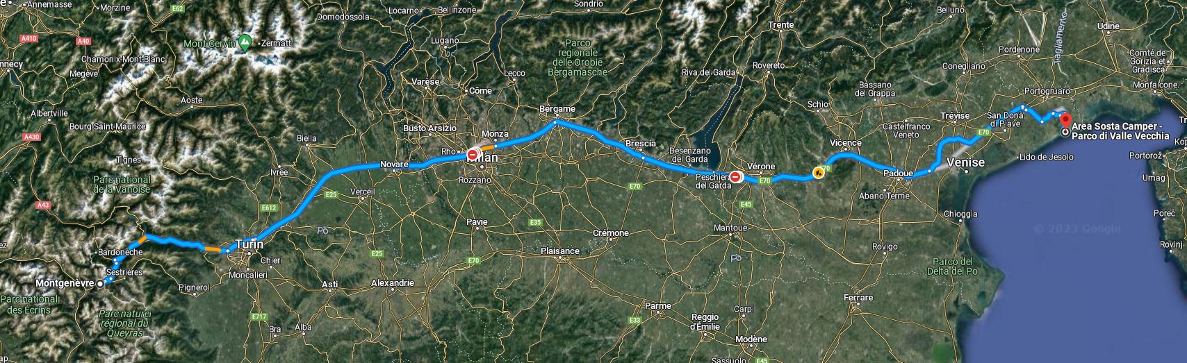 Ce matin au réveil nous sommes dans le brouillard et le thermomètre affiche 5 petits degrés. A 9 heure nous prenons la route direction la frontière de la Slovénie par l'autoroute. Sur les premiers 100km nous trouvons beaucoup de travaux ça nous ralentie mais on fait avec. Nous passons par Turin, puis Milan, Bergame, et nous contournons Venise. La pluie nous accompagne une partie de la matinée puis le soleil revient parmi nous. La pause déjeuner se fait sur une aire de l'autoroute entre Milan et Brescia. L'aprés midi est marqué par un trafic intense de poid lourds. A 19h nous décidons de nous arrêter sur une aire à 80km de la frontière Slovéne. Une journée encore bien remplie 588km au compteur. Ce soir le repos s'impose, demain, nous passons en Slovénie première étape de notre périple .
