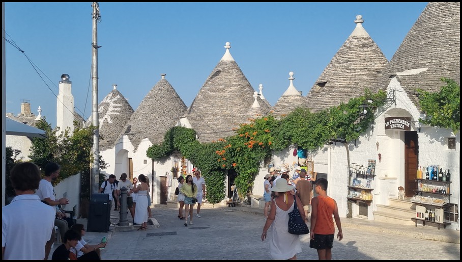 Aujourd'hui nous restons à Alberobello. Nous irons vister les deux quartiers de trullis dont un qui à été restauré en 1983. La visite de ces quartiers est bien différente de celle d'hier, ils sont beaucoup plus authentiques, ici pas de commerce, juste des habitations où pour certains des gîtes. Le trullo (un trullo des trullis), à une finition au niveau du toit différente, soit une boule, soit une pierre plate où une pointe, cette finition représentait la richesse des propriètaires du trullo. Nous allons visiter un trullo qui a été restauré. L'intèrieur est restauré avec des meubles d'époque, la surface moyenne d'une habitation était de 30 métres carré, et la partie haute servait à stocker le grains. Retour au camping-car vers 18 heures et ce soir nous sortons à 21 heure pour aller à une fête qui se tient dans un parc à proximité de l'aire.