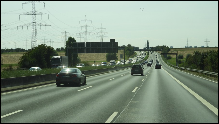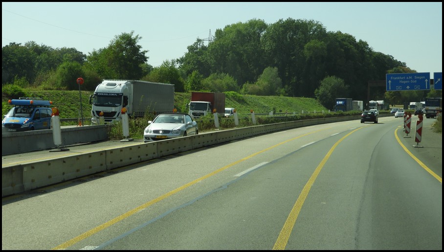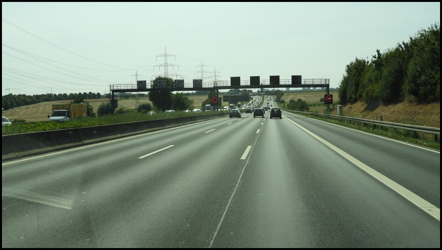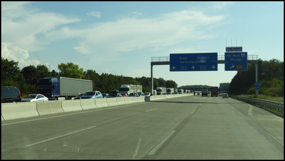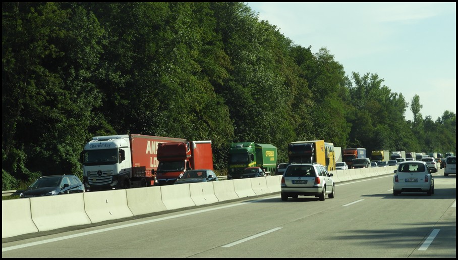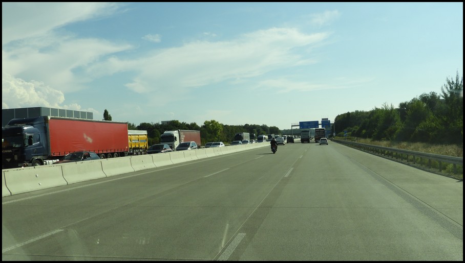 Levés aux aurores ce matin,c'est une grande étape qui nous attend aujourd'hui on descend sur Obernai en Alsace une étape de 701 kms elle se fera en une seule fois tout le long de la route il y a principalement que des travaux et ralentissements et bouchons et un trafic routier trés important surtout des poids lourds sur tout ces kilomètres je n'ai jamais vu ça de toute nationalité confondu,les premières maisons à colombage apparaissent,on couchera pas en France ce soir mais à 3 kilomètres de la frontière sur un parking d'un concessionnaire de CC avec eau vidange électricité tout gratuit,étape de la journée 701 kms avec la chaleur.