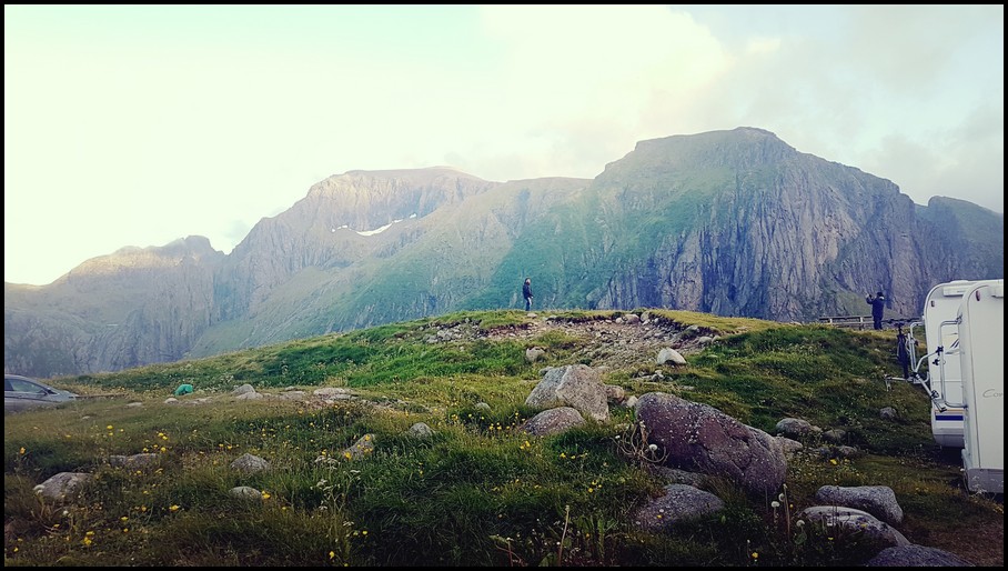 Après une courte nuit car nous avons attendu le soleil de minuit qui était au rendez vous hier soir. Nous étions de nombreux camping car à l'attendre ainsi que les Norvégiens venus en nombre avec leur toiles de tentes malgré le petit degré 12°. Ce soleil qui ne se couche pas est fabuleux et la lumosité incroyable avec cette couleur orangé on le voit descendre à l'horizon et remonter par la suite sans disparaitre.Nous avons fêté ça avec un verre de champagne ce qui était normal pour notre premier soleil de minuit. Il était 1h30 quand nous nous sommes couchés et ce matin on prend la direction de Henningsaer baptisé la petite venise je pense que son nom est on rapport avec toutes ses petites îles rocheuses qui l'entourent,pause déjeuner dans ce village ensuite on reprent la route pour Andenes dans les Vesteralen une partie plus sauvage des Lofoten. On se pause à 100 kms du lieu prévu sur un parking gratuit et toujours la vue sur les montagnes et un fjord on ne s'en lasse pas de ses paysages manifiques.Etape 192 kms parking gratuit sans service juste eau et toilette.